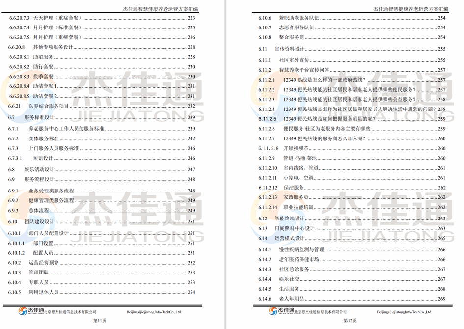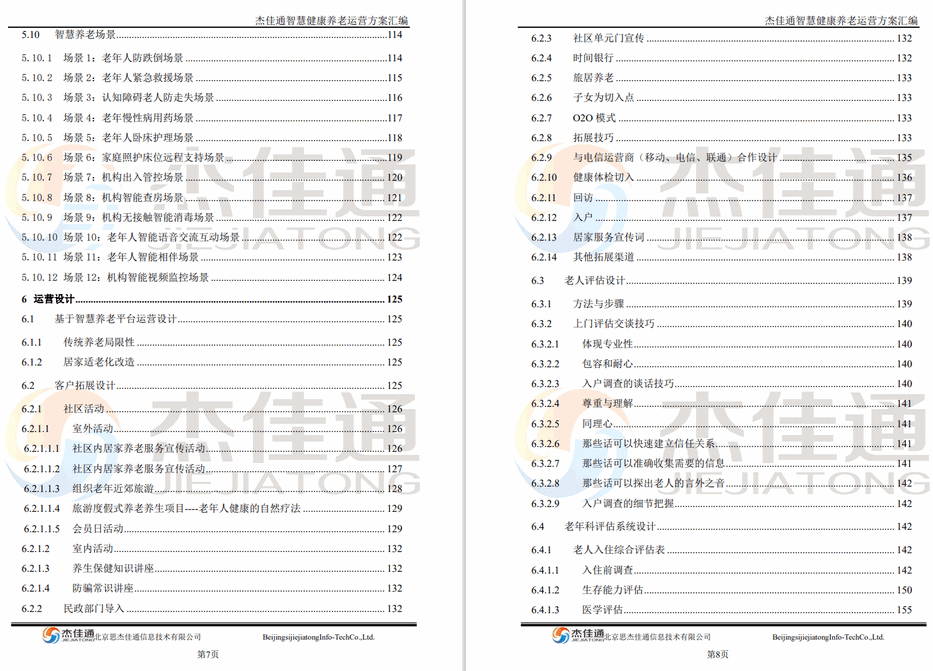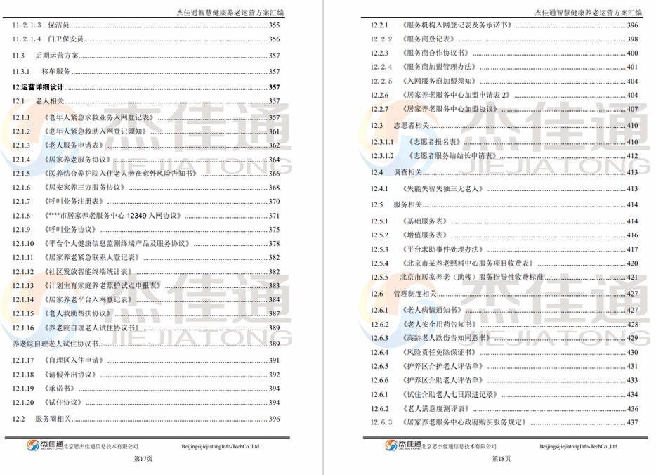 本養(yǎng)老運營方案凝聚了杰佳通工程師們16年的心血,總結(jié)出了居家養(yǎng)老、機構(gòu)養(yǎng)老、社區(qū)養(yǎng)老運營過程中團隊組建、運營設計、方案設計、活動設計、老人心里分析、各種環(huán)境下的養(yǎng)老運營盈利模式等等,方案每月都在更新,目前已經(jīng)更新到近千頁,方案精細,細致到在社區(qū)如何組織老人活動,如何書寫宣傳語,如何和老人簽訂協(xié)議,即使你是“0”基礎(chǔ)入門養(yǎng)老,也可以讓您快速上手,快速盈利;既避免了您少走彎路,又避免了在簡單事情上浪費時間,充分把杰佳通智慧養(yǎng)老平臺的精髓融入到養(yǎng)老運營中。